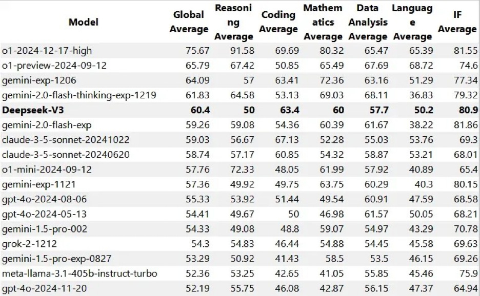 The preliminary LiveBench results paint an impressive picture of DeepSeek-V3-Base's capabilities across multiple domains. The model has shown strong performance in:
