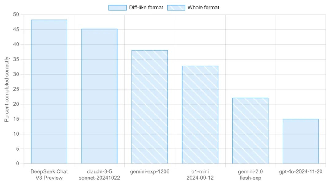 In recent evaluations using the Aider multilingual programming benchmark, DeepSeek-V3-Base has demonstrated remarkable capabilities. The benchmark, which tests models across 225 challenging programming problems in languages including C++, Go, Java, JavaScript, Python, and Rust, showed DeepSeek-V3-Base achieving a 48.4% success rate—a dramatic 31% improvement over its predecessor's 17.8%.