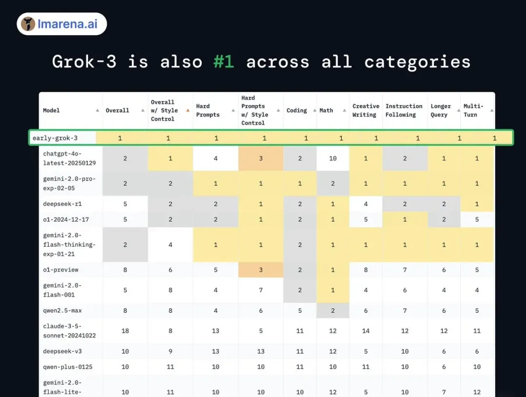 Grok 3 currently leads the Chatbot Arena rankings, marking the first time a model has ranked first across all categories. These rankings are based on blind human evaluations, lending credibility to its capabilities.