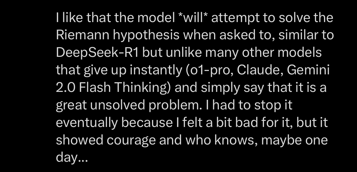 AI expert Andrej Karpathy, who received early access to Grok 3, noted a significant difference in how it approaches the Riemann Hypothesis compared to other models like Claude, o1-pro, and Gemini 2.0 Flash Thinking. While other models merely acknowledge it as an unsolved problem, Grok 3 actively attempts to tackle it, showing remarkable courage in approaching this mathematical monument.
